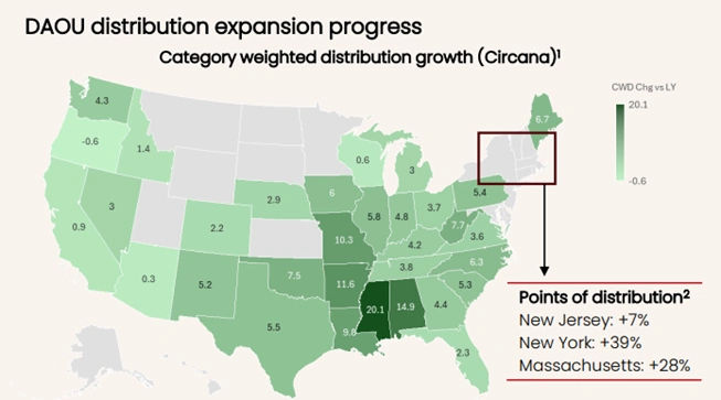 DAOU has established itself as the number one Luxury wine brand in the United States. The brand achieved 8.2% net sales revenue growth in F25. Distribution expanded significantly across key states, including New York, Massachusetts and New Jersey.
