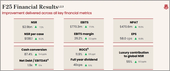 Treasury Wine Estates recently reported its FY25 annual results on 13 August 2025. The Company delivered net sales revenue of AUD 2.9 billion, up 7.2% from the prior year. Earnings before interest, tax, material items and SGARA reached AUD 770.3 million, representing 17.0% growth.