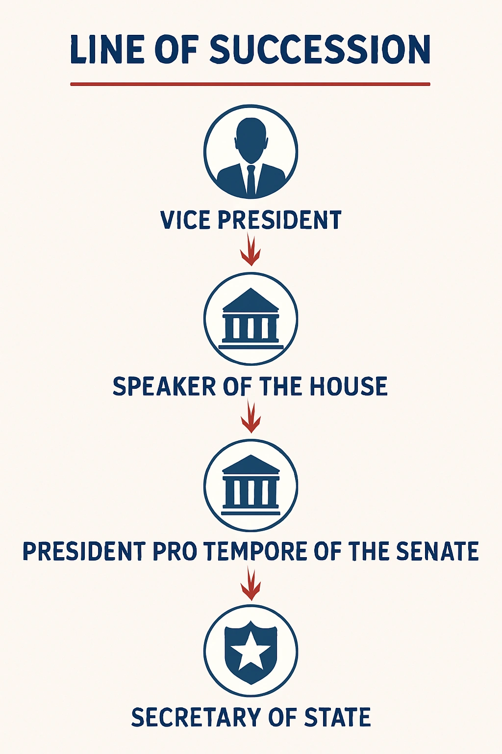 In the event of a death or incapacitation of the incumbent president, the vice president will automatically assume office. The present vice president JD Vance, openly declared that he was willing to be called upon to succeed. Following the vice president is the Speaker of the House, then the President pro tempore of the Senate and the members of the cabinet in order of their designation as departments.