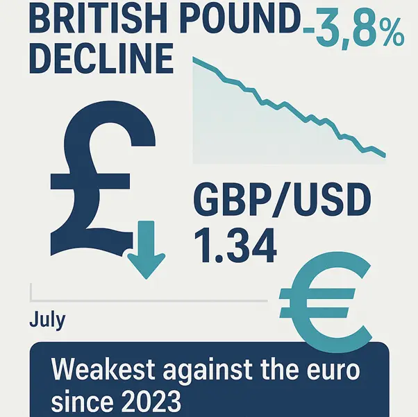 The British pound trades at 1.3432 against the US dollar as of 27 August. Sterling declined 3.8% in July marking its steepest monthly fall since September 2022. Currency weakness reflects concerns about UK fiscal conditions and declining economic indicators. The pound reached 87.69 pence per euro last week representing its weakest level since May 2023.