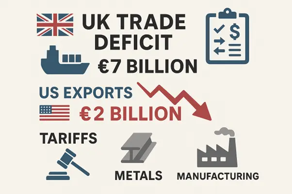Trade deficit widens to £7 billion in April from £3.7 billion in March. The largest trade gap since June 2022 reflects export difficulties. Manufacturing sectors adapt to tariff implementation. Service exports maintain resilience despite goods trade challenges.