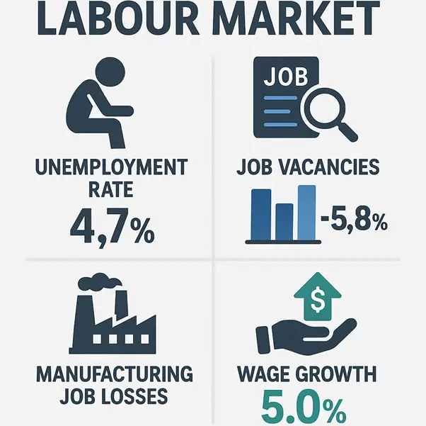 Unemployment rate forecasts suggest stability around 4.7% through year-end. Payroll tax increases continue cooling demand for labour. Wage growth moderation expected from current 5% levels. Job vacancy levels remain below pre-pandemic benchmarks with further declines anticipated.