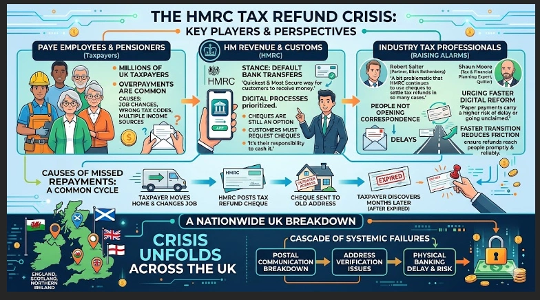 The crisis unfolds across the United Kingdom, affecting taxpayers in England, Scotland, Wales, and Northern Ireland. A large number of missed repayments happen because HMRC sends letters and cheques to old addresses — a common example is someone who moves home after changing jobs, only to discover months later that a tax refund cheque was posted to their previous address and expired before they could cash it. The breakdown does not occur at a single point; it cascades across the entire chain of postal communication, address verification, and physical banking.