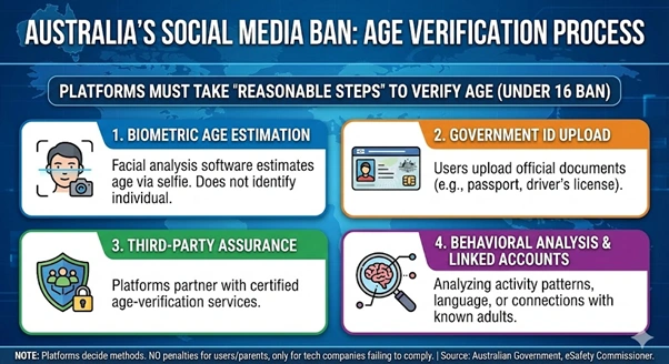 The government urged social media networks to employ minimally invasive techniques for verifying user ages. Methods include facial age estimation via video selfies, government identification submission, or bank card verification. Users over 16 who are incorrectly classified as underage can navigate appeals processes. Meta utilises facial verification through Yoti, requiring video selfies or government-issued identification. TikTok provides multiple appeal options including facial age estimation or government-approved identification submission.​