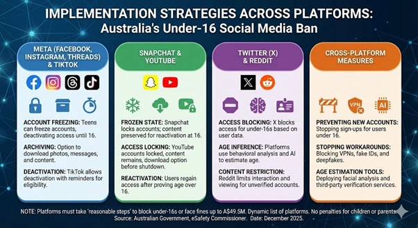 Meta, parent company of Facebook, Instagram, and Threads, began shutting down accounts for teens from December 4. Users mistakenly removed have the option to verify their age using government identification or by providing a video selfie. TikTok allows users to deactivate or delete their accounts and archive existing content. Users can submit an email for a reminder when they become eligible to log back in. Snapchat permits users to download their data while locking accounts until they verify their age. The platform implements a frozen state for accounts that platforms can reactivate upon reaching the appropriate age.​