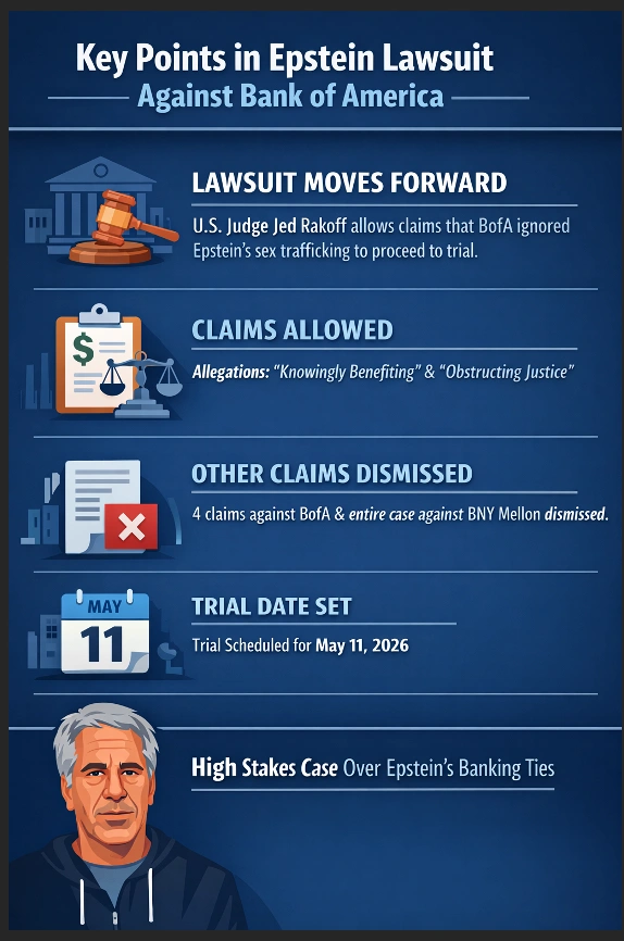 In a detailed opinion issued this week, U.S. District Judge Jed Rakoff said the plaintiffs had presented sufficient allegations that Bank of America acted with “reckless disregard” regarding Epstein’s conduct. The decision permits two major claims to proceed toward trial, while dismissing several others.
