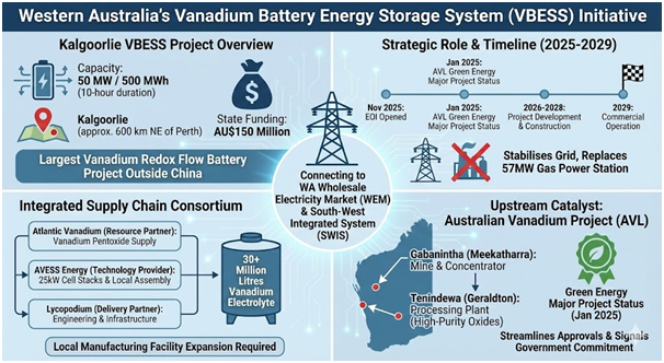 The Western Australian government committed to supporting major vanadium battery initiatives. The Cook Labor Government opened expressions of interest for a 50 megawatt, 500 megawatt-hour vanadium flow battery system in November 2025. The state committed AU$150 million toward the vanadium battery energy storage system. The facility will be located in Kalgoorlie, approximately 600 kilometres northeast of Perth.​