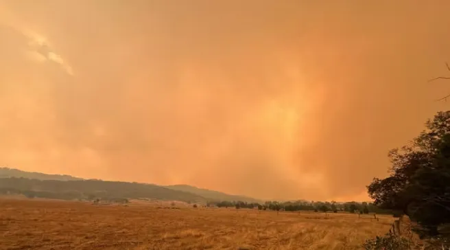 Figure 3: Thick smoke from active bushfires turns the sky orange over farmland in Victoria amid extreme fire danger ratings. [Source: news.com.au]