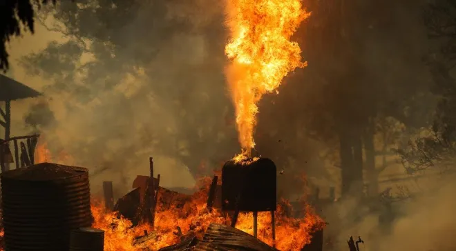 Figure 1: Flames engulf structures as a bushfire burns during catastrophic conditions in regional Victoria, prompting a statewide total fire ban. [Source: news.com.au]