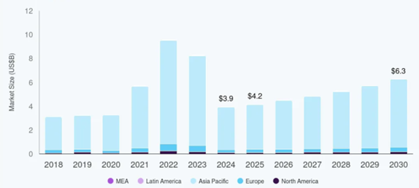 The global rare earth elements market was valued at USD 3.95 billion in 2024 and is forecast to reach USD 6.28 billion by 2030, at a compound annual growth rate (CAGR) of 8.6% between 2025 and 2030.