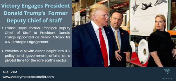 Victory Metals Limited (ASX: VTM) (“Victory” or “the Company”) has announced a major step in advancing its international strategy with the appointment of Emma Doyle, former Principal Deputy Chief of Staff to U.S. President Donald Trump, as Senior Advisor for U.S. Strategic Engagement.