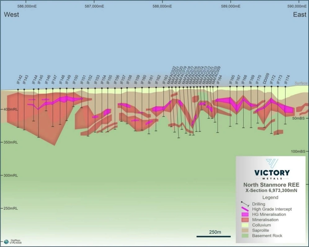 Figure 3: Cross-section diagram of North Stanmore REE along 6,973,900mN facing north, displayed with five times vertical exaggeration, highlighting the zone of high-grade mineralisation