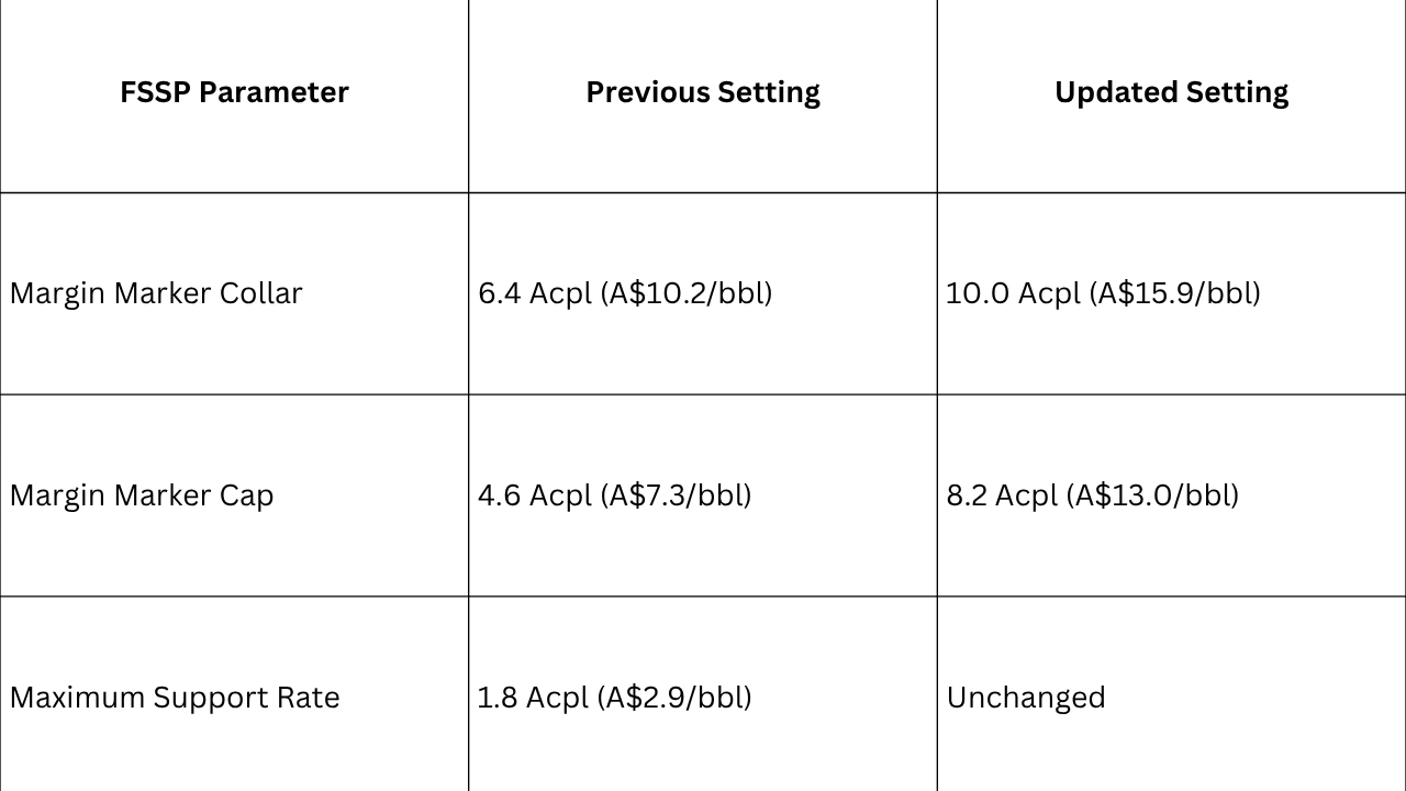The Federal Government’s updated FSSP settings reflect the significant rise in cash operating costs at Australian refineries since the scheme commenced on 1 Jul 2021. The maximum support rate of 1.8 Acpl (A$2.9 per barrel) on actual production of key transport fuels, being gasoline, jet and diesel, remains unchanged.