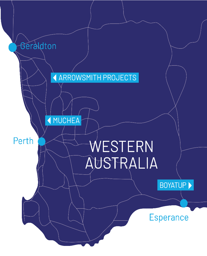 Arrowsmith is located 270km north of Perth. Arrowsmith North boasts a minimum 25-year mine life capable of producing more than 2Mt tonnes per year of high-grade (99.7% SiO2)* silica sand for export to the foundry, container glass and flat glass markets in Asia, with permitting well advanced, and will lead production. Muchea, located 50km north of Perth, is an ultra-high-grade (99.9% SiO2)* silica sand project capable of producing sand required for ultra-clear glass for solar panels and other high-tech glass applications. Boyatup, located 100km east of Esperance, is under development and capable of producing sand for the glass market.