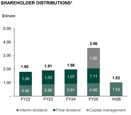 • Capital management distribution of $1.50 per share paid in December 2025, comprising a capital return of $1.10 per share and a fully-franked special dividend of $0.40 per share