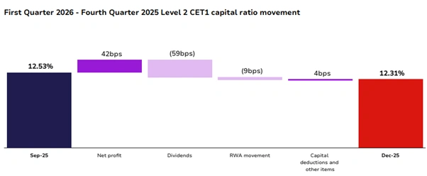 Non-credit RWA declined by $2.5 billion, with operational RWA falling by $4.7 billion following the removal of the remaining $500 million operational risk capital overlay. Market RWA increased by $0.9 billion due to higher market risk exposures, while the capital floor RWA adjustment stood at $1.5 billion at 31 December 2025.