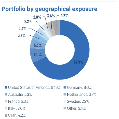 Geographic exposure remained heavily weighted towards the United States, representing the dominant portion of the portfolio. Germany accounted for the second-largest country allocation, followed by Australia, the Netherlands, and France. Sweden, Italy, and other countries made up the remaining exposure.