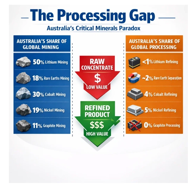Australia controls more critical mineral reserves than almost any nation on Earth. Yet it processes barely a fraction of what it digs from the ground.