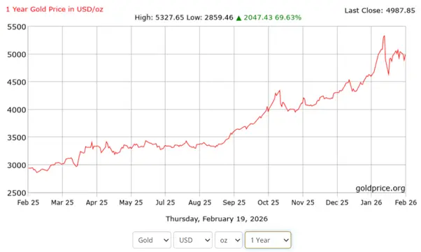 Figure 3: One-year gold price performance in US dollars per ounce, highlighting the metal’s strong rally. [Source: GoldPrice.org]