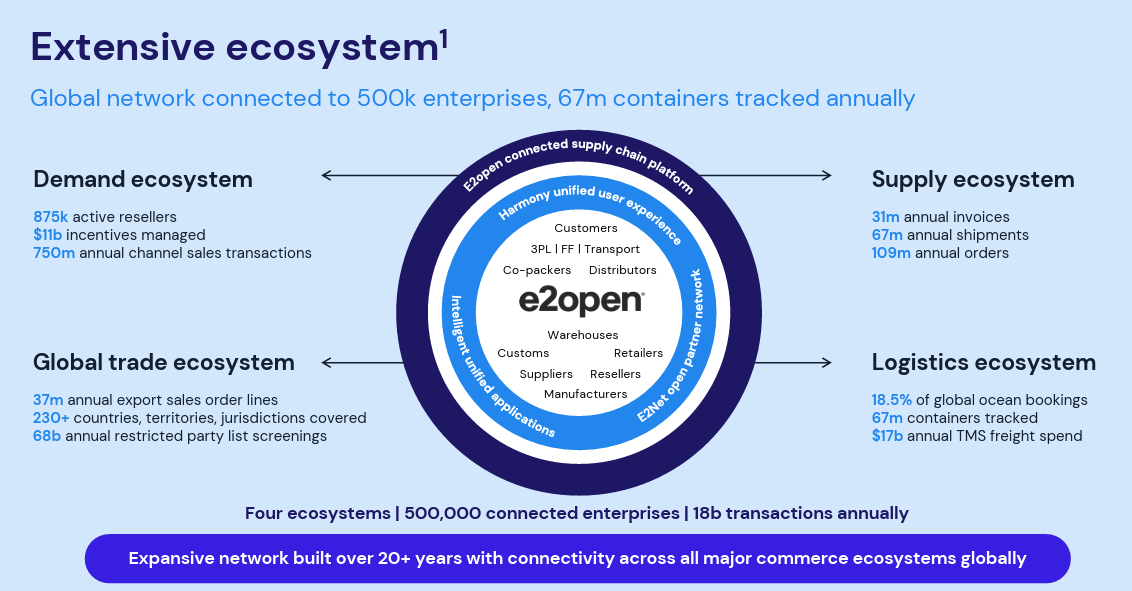 E2open’s Extensive Ecosystem: A global supply chain platform connecting 500,000 enterprises across four ecosystems, enabling 18B transactions and tracking 67M containers annually