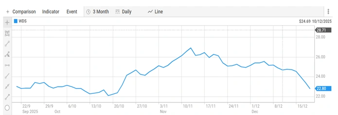 Woodside Energy Group shares last traded at AUD 22.805 per share. The stock has traded within a 52-week range of AUD 18.610 to AUD 27.300 per share. The Company’s market capitalisation stands at AUD 44.52 billion, positioning it as a major player in global energy markets.