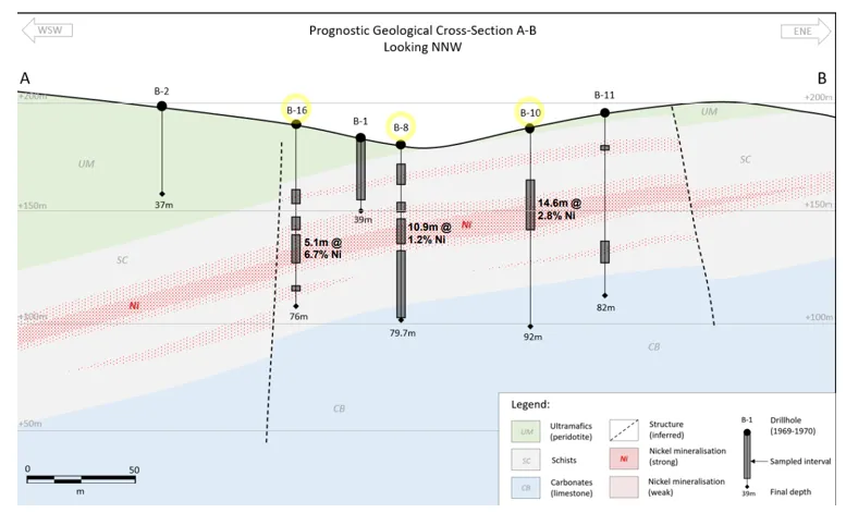 Figure 3: Sockovac (Petrovo) cross-section showing historical drill holes with interpreted geology and high-grade nickel intersections [Yugo Metals Limited]