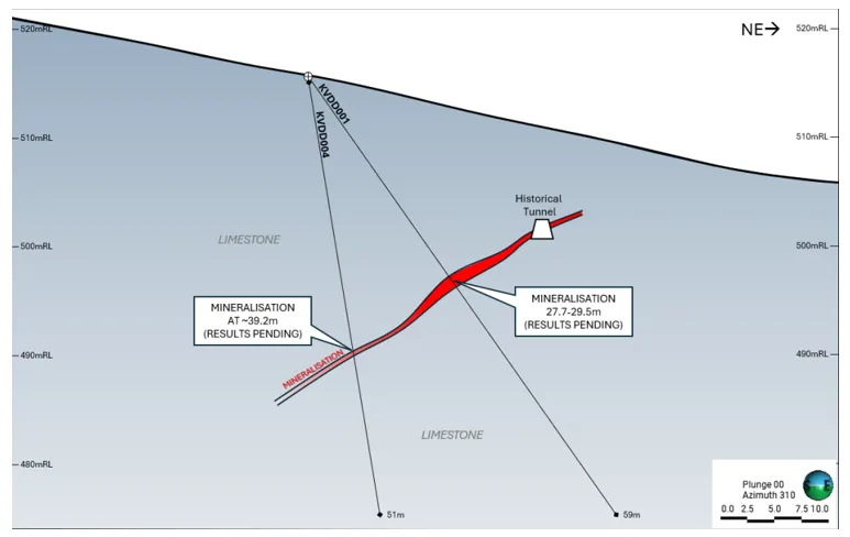 Figure 2: Cross-section showing drillholes KVDD001 and KVDD004 with visible mineralisation zones [Yugo Metals Limited]