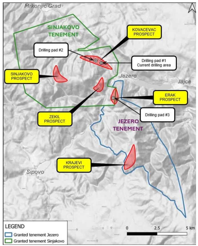 Beyond Kovacevac, Yugo has identified multiple high-priority prospects across the Sinjakovo tenement, including the Sinjakovo, Erak, and Zekil prospects, as well as targets within the Jezero tenement area.