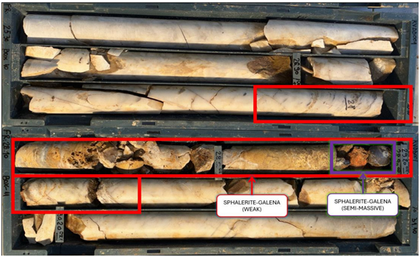 The mineralisation comprises dominant sphalerite and silver-rich galena with minor chalcopyrite and antimony-tetrahedrite. Significantly, 0.2 metres of semi-massive mineralisation containing 30 to 40 percent sulphides was intersected adjacent to a narrow core loss interval, suggesting potentially higher grades within the zone.