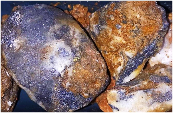 Figure 4: Drillhole KVDD001, drill core pieces (~10x5cm) showing blue-grey galena and sphalerite, with minor yellow chalcopyrite specs (interval 28.7-28.9m depth)