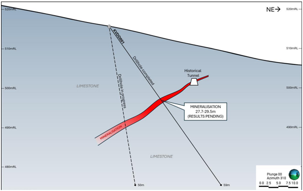The central hole, KVDD002, intersected weaker mineralisation over 0.9 metres from 22.6 metres depth. The westernmost hole, KVDD003, encountered what appears to be an unrecognised medieval mining tunnel at target depth, highlighting the area’s extensive historical mining activity.